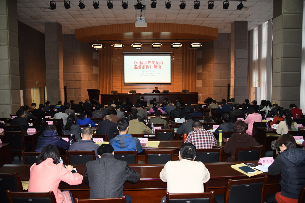 为认真学习贯彻党的十八届六中全会精神,全面深入推进“两学一做”学习教育,进一步加强思想道德建设,牢固树立党员的党章党规党纪意识,11月29日下午,结合处科级干部、系主任及党务干部学习培训,学校党委中心组举行第11次(扩大)学习会,专题学习十八届六中全会新修订的《中国共产党党内监督条例》。校领导马国防、陈兴炎、吴国荣、陈展虹、沈光辉到会学习,全校处科级干部、系主任、各党总支和党支部支委、党务干部也共同参加学习。纪委书记王幼新主持学习会。