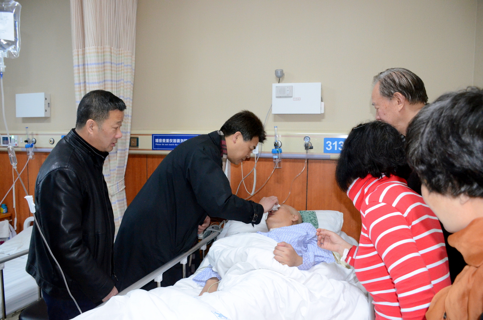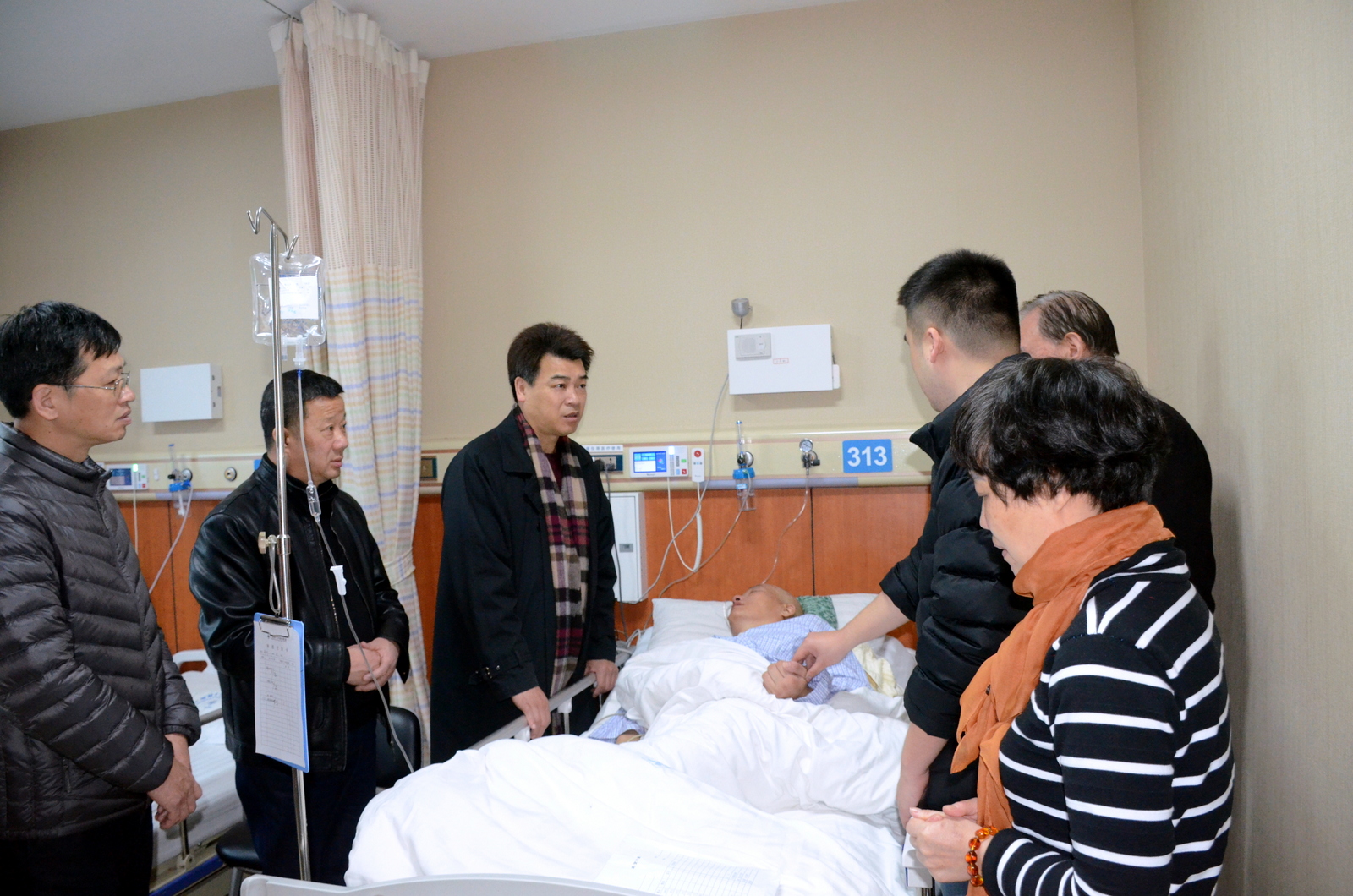 在医院病房,马国防拉着昏迷中郑元齐的手,向他表达了全体校领导、教职工的关心和祝福,希望他战胜伤病,早日康复,回到工作岗位中。