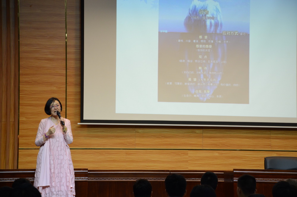 讲座在一段冥想音乐中开始,黄老师用柔缓、优美的语言引导大家开始了一段认识自己的心灵之旅。她通过对萨提亚模式的讲解和分析,从每个人对自我的认知开始,引导大家逐步遇见一个未知的自己,引起学生的强烈共鸣。在现场互动中,黄老师邀请师生代表扮演角色,从人的行为、应对方式、感受、感受的感受、观点、期待、渴望、自我的心理视角剖析人是如何遇到认知问题,并通过现场互动的方式提出了出现矛盾冲突时如何找回自我的解决之道。