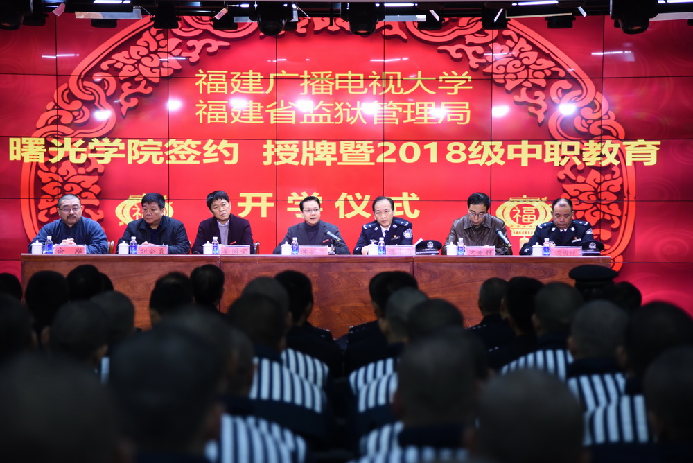学校有关部门负责人,省监狱管理局部分机关领导及福州地区七个监狱的主要领导,福建省网龙普天教育科技有限公司总经理吴继平等一同参加签约、授牌暨2018级中职教育开学仪式。