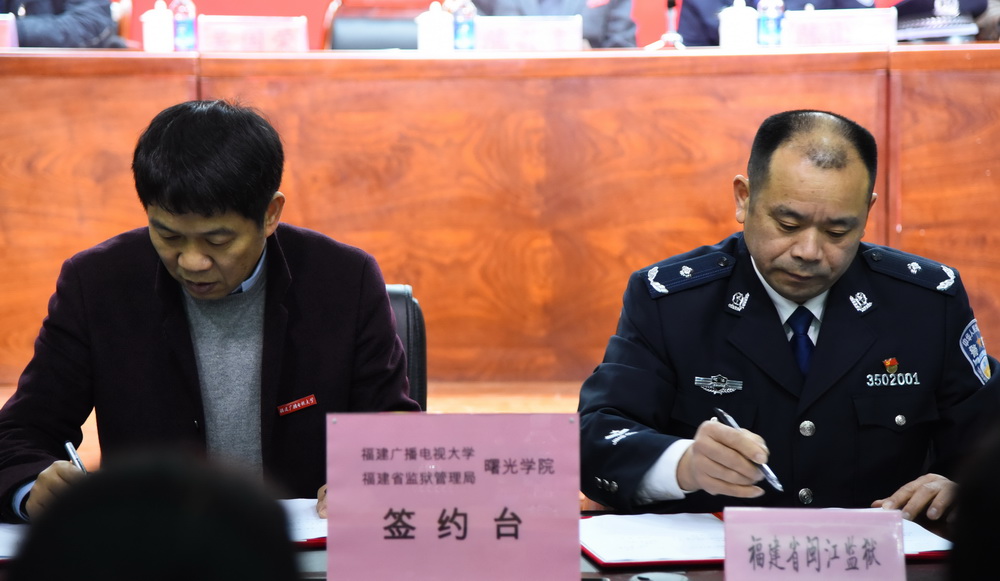 校长吴国荣、闽江监狱监狱长艾贵祥分别代表校方和承办方签署《合作办学协议书》