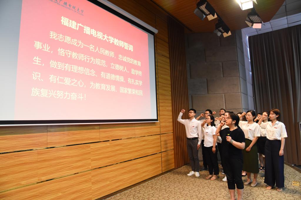 会议举行了新教师宣誓仪式。今年首批招录的12名新教师,在李燕芳老师的带领下,宣誓努力成为有理想信念、有道德情操、有扎实学识、有仁爱之心的“四有”教师。