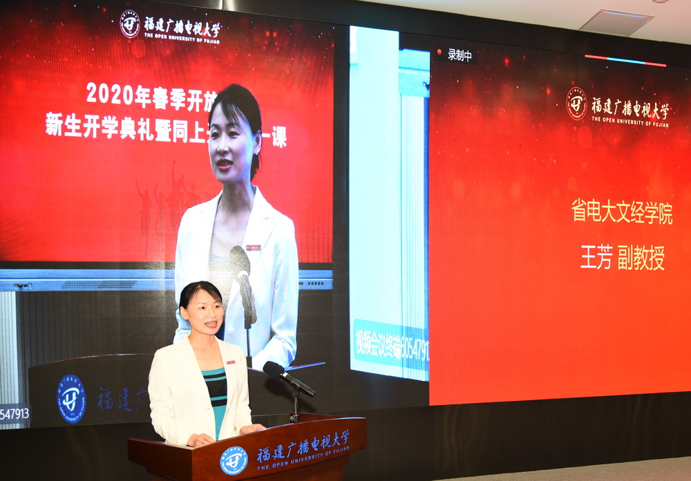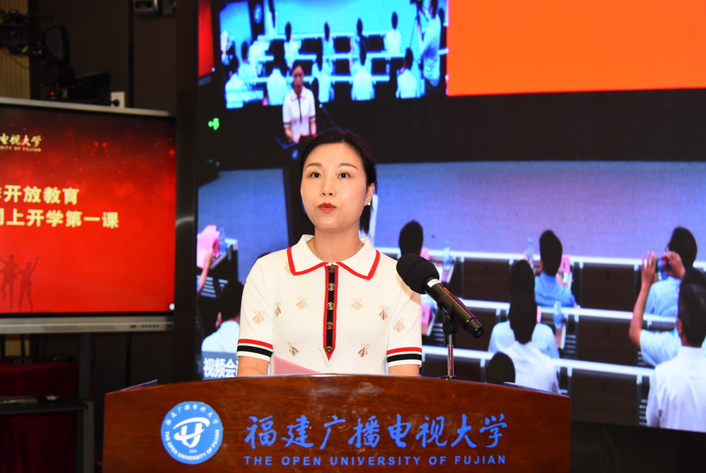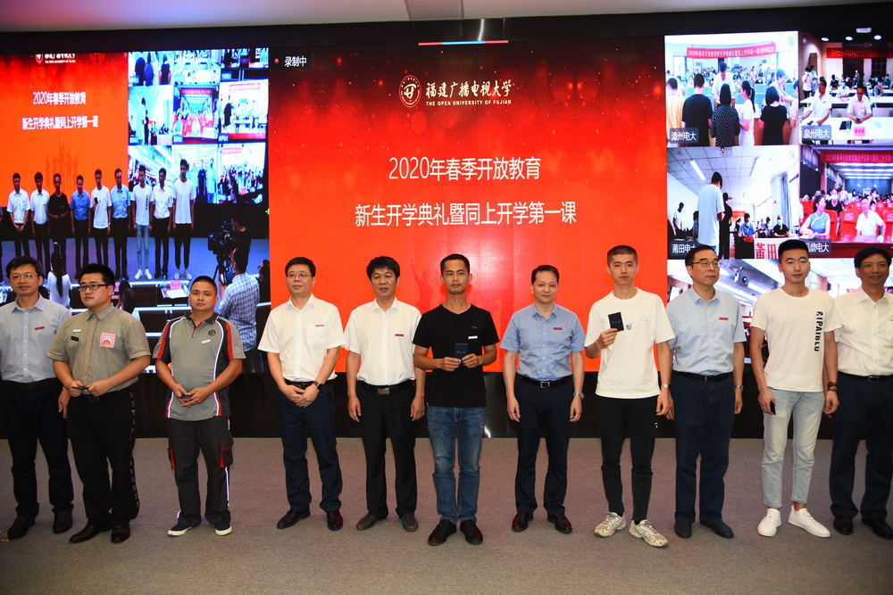 马成斌主持开学典礼。在嘹亮雄壮的国歌声中,福建广播电视大学2020年春季开放教育新生开学典礼暨同上开学第一课正式启幕。各地电大领导分别在当地为国家开放大学2019年度优秀毕业生颁发了获奖证书。本科新生代表、专科新生代表、在校生代表和教师代表在当地电大发言。各地电大校领导为新生代表佩带校徽、颁发学生证,新生同步进行了入学宣誓。
