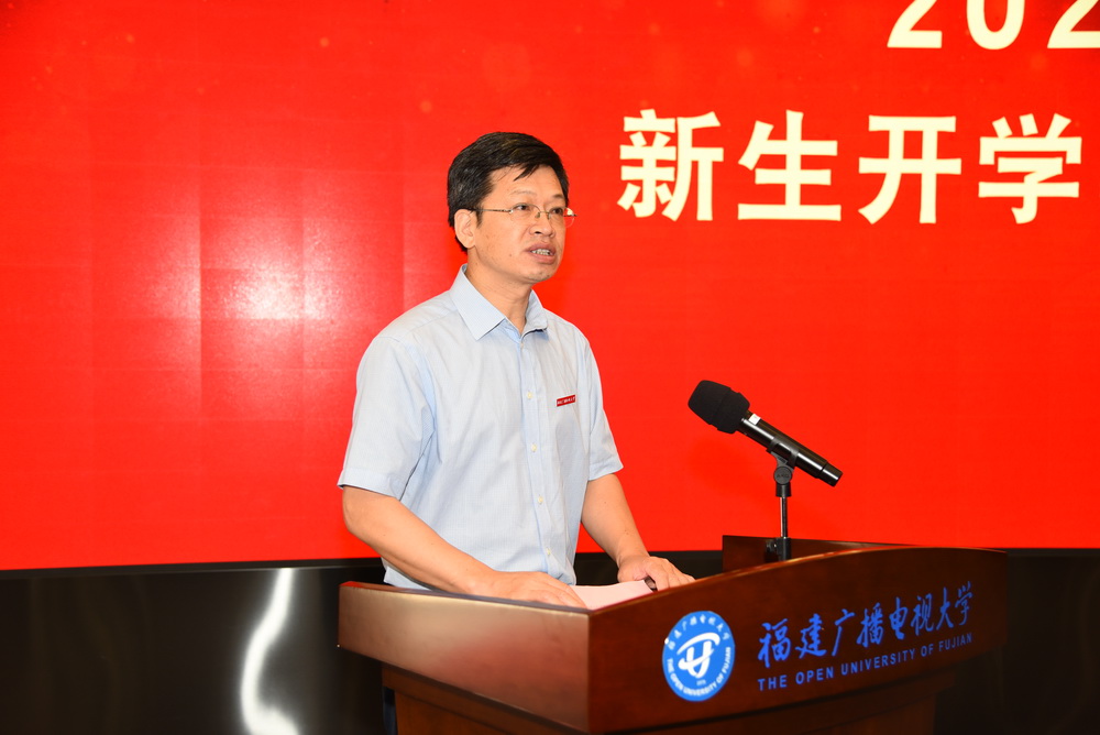党委书记陈兴炎以《坚定信心共克时艰 不负韶华逐梦前行》为题,为新生开讲第一课。他深情回顾了广播电视大学成立渊源和福建广播电视大学光辉的发展历程,介绍了学校以“12335”工作模式助力青年成长、“三全育人”抓落实的情况,并从“了解疫情中的‘中国之治’,坚定对国家的信心”,“福建电大与你共成长,坚定对学校的信心”,“不负韶华逐梦前行,坚定对自己的信心”三个方面,要求大家坚定信心不动摇,传承“自强弘毅,励学敦行”的校训精神,勇于担当,奋发有为,自觉融入到新时代新福建建设之中,努力为实现中华民族伟大复兴的“中国梦”添砖加瓦。