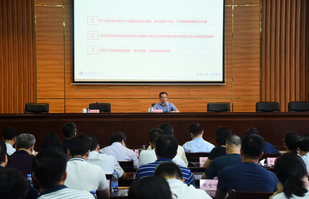 8月22日上午,党委书记陈兴炎在桂山校区博厚楼会议厅为学习贯彻党的十九届四中全会精神集中培训班学员作《贯彻落实党的十九届四中全会精神 完善学校治理体系 提升办学治校能力》专题辅导报告,强调要以习近平新时代中国特色社会主义思想为指导,全面贯彻落实党的十九届四中全会精神,进一步统一思想、凝心聚力,切实把全会精神落到实处,为推动有特色高水平福建开放大学建设提供坚强保证。党委副书记、校长吴国荣主持会议。校领导马成斌、沈光辉、王幼新、李正光出席。