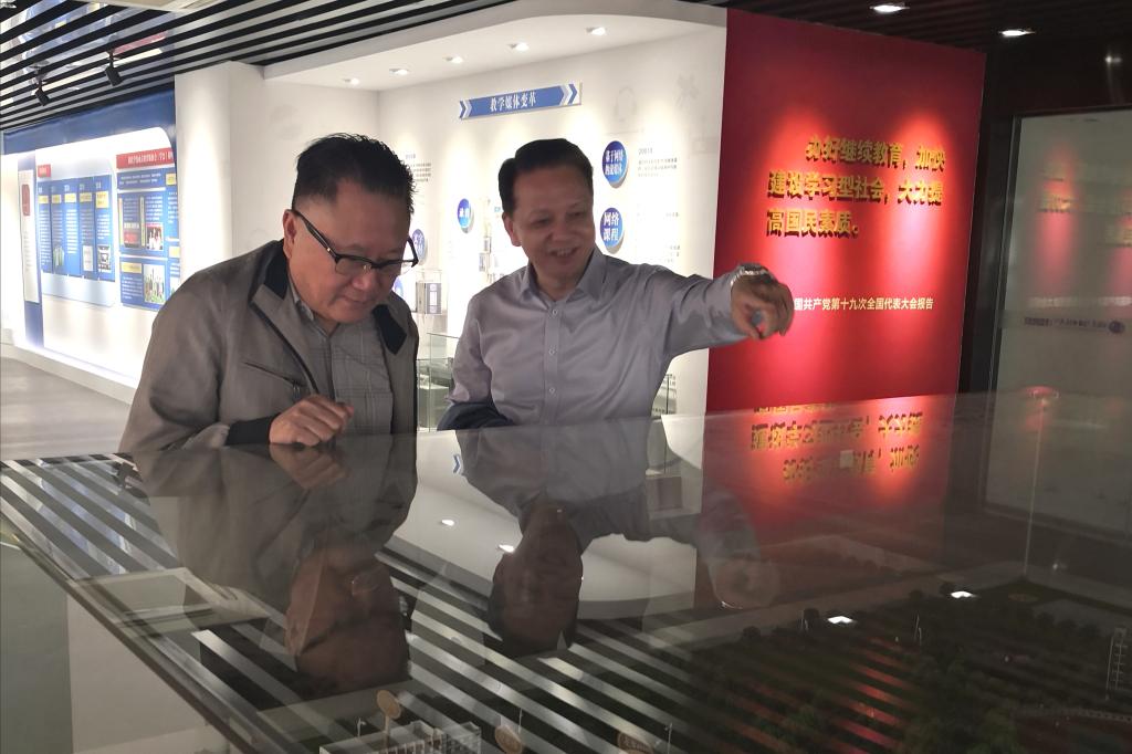 在陈兴炎陪同下,黄宝庆参观了数字图书馆、智慧教室等办学设施,观看了校史馆,对母校发生的变化和取得的成绩表示由衷的喜悦和赞赏。