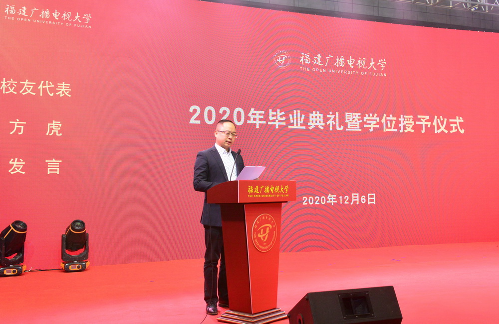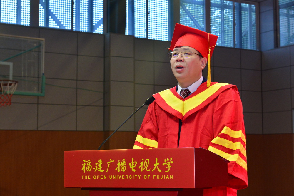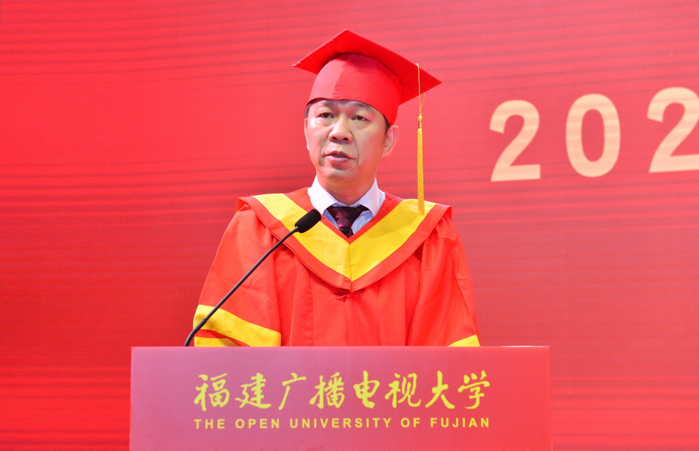 校党委书记陈兴炎致辞。他对同学们顺利完成学业表示祝贺,对同学们踏上新征程提出希望和要求:一要坚守初心,厚植爱国情怀。“国家好,民族好,大家才会好”,希望同学们将小我融入大我,将个人的发展与国家的前途命运联系在一起,主动担当时代责任,努力成为中华民族伟大复兴的追梦人和奋斗者,为全面建设社会主义现代化国家奉献自己的力量。二要坚定信心,做最好的自己。福建电大学子分布在八闽大地的各行各业,有“最美法官”黄志丽、群众脱贫致富带头人陈镇洲、新一代企业领军人物余雄智、新时代农民林慧杰。希望同学们以师兄师姐们为榜样,不妄自菲薄,发挥自己勤奋好学,勇于奋斗,敢拼爱贏的劲头,在奋勇搏击中放飞人生梦想。三要树立恒心,践行终身学习。希望同学们把毕业作为新起点而不是终点,不断学习新知识和新技能,不忘充实自己,提升综合素养,用知识和能力时刻迎接新的挑战,不断实现自我超越。四要珍惜所有,保持感恩之心。今天的中华民族迎来了从站起来、富起来到强起来的伟大飞跃,希望同学们面向未来,常怀感恩之心,感恩伟大的时代,感恩家人的支持,感恩老师的培养,饮水思源,行稳致远。