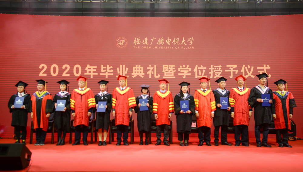 党委副书记马成斌、副校长李正光分别宣读了福建电大2020年毕业生名单和学位获得者名单,经国家开放大学学位评定委员会审议决定,全省共有185人被授予国家开放大学学士学位。同时,学校还与宁德师范学院合作开展成人高等教育学士学位授予工作。此次共有学前教育专业陈颖、陈婷等13人被授予成人高等教育学士学位。校领导和国开学位评定委员会委员为主会场毕业生代表颁发毕业证书,各地电大同步颁发毕业证书;校领导和国开学位评定委员会委员共同为毕业生代表颁发学士学位证书并授学士礼。教师、毕业生、校友代表分别发言。仪式在全体人员共同合唱欢快高昂的校歌声中圆满结束。