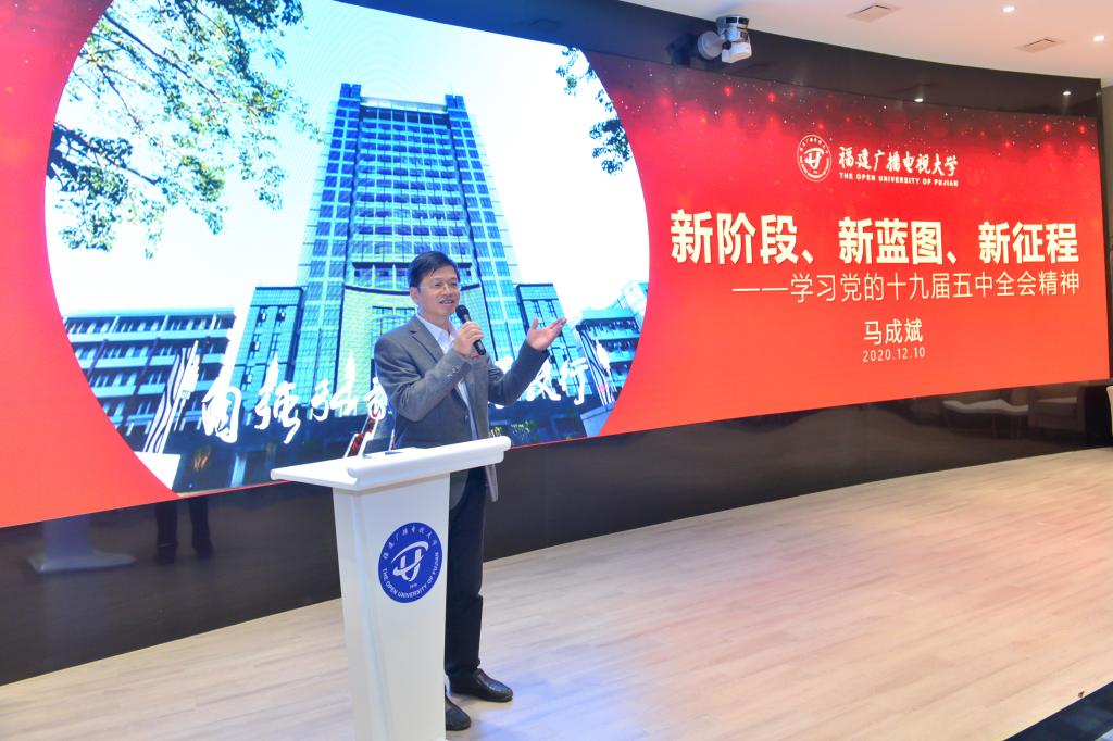 福建广播电视大学党委副书记马成斌以“新阶段、新蓝图、新征程”为题,为“专班”新生上第一堂课,宣讲党的十九届五中全会精神。他结合自身学习,从大会意义、新阶段新目标、在统筹国内国际两个大局中办好中国的事情、构建新发展格局和实现新发展目标等方面对党的十九届五中全会精神进行了深入浅出的阐述。他要求,“专班”学员今后要明确自己的前进方向和奋斗目标,做到学以致用,在平凡的岗位上做出不平凡的业绩,努力为环卫事业添砖加瓦。