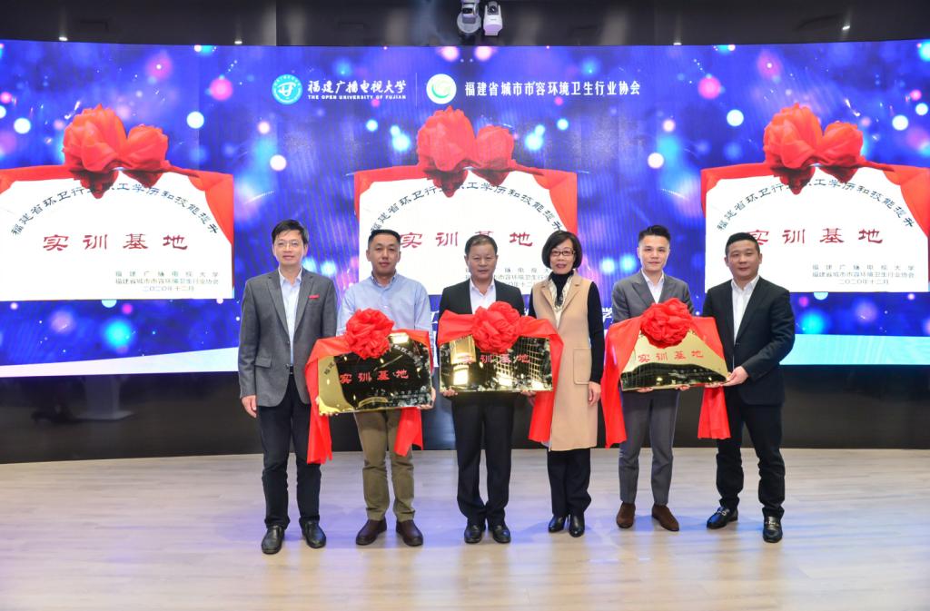 马成斌、刘冰新、寇亮共同为福州凯蓝清洁服务有限公司、福州思洁保洁服务有限公司、福州红庙岭垃圾焚烧发电有限公司三家校外实训基地授牌。