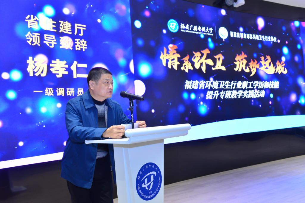 省住建厅一级调研员杨孝仁致辞:“在省总工会、福建广播电视大学的大力支持下,全省环卫职工的素质和技能得到进一步提升,这对环卫行业的飞跃发展有促进作用。希望环卫职工能够在此次专班中增强学习能力、劳动能力、维权能力、实践能力,更好地在环卫岗位上做出更大的贡献!