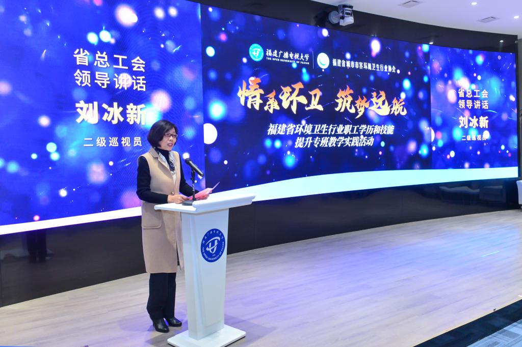 12月10日下午,以“情系环卫 筑梦远航”为主题的福建省环境卫生行业职工学历和技能提升专班教学实践活动在福建广播电视大学左海校区智慧教室拉开帷幕。首批85名“专班”新生有保洁员、环卫工人、清洁器械销售员,也有环卫装备制造工人。福建省总工会二级巡视员、省财贸轻纺烟草医药工会工委主任刘冰新、福建广播电视大学党委副书记马成斌、福建省住房和城乡建设厅一级调研员杨孝仁、福建省财贸轻纺烟草医药工会工委二级调研员上官步升、福建省城市市容环境卫生行业协会会长寇亮和福建省城市市容环境卫生行业工会联合会主席欧丽彬出席了活动。