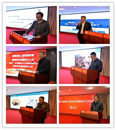会上,廖凤英代表长汀县委、县政府对福建广播电视大学即将更名挂牌福建开放大学表示良好的祝愿,并对电大思政工作提出了建设性的意见。文经学院、漳州分校、泉州分校、长汀工作站和优秀班主任代表作了主题发言。文经学院院长刘玉兴以“以立德为根本为党育人、以树人为核心为国育才”为题,介绍了学院思政工作的特色做法和思考体会。漳州分校党委书记、校长李然以“贯彻落实“十大育人”体系,探索‘一校一特色’思政工作新路子”为题,分享了以文化为抓手开展思政工作的经验做法。泉州分校党总支副书记郑少俊以“乡村振兴人才学历提升计划”项目学生思政教育工作为例,提出将本地红色资源有机融入到思政实践教学的特色做法。长汀工作站站长肖贞祥代表会议承办方,向与会人员介绍了学校传承红色基因,发挥“云思政”优势,助力“互联网+思政”模式,实现“三全”育人的思路和举措。优秀班主任代表章学珠作了“统一模式、思想引导、教学策划、创业指导、校园文化、树立标杆”六个转变,激发班主任工作新活力的经验交流。