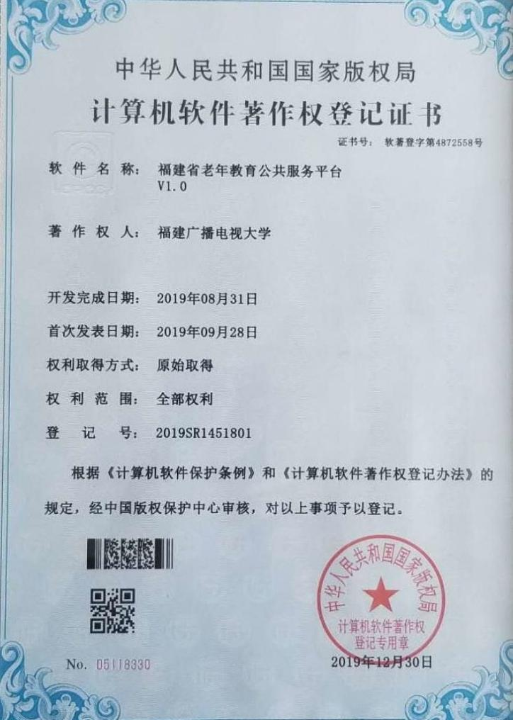 福建省老年教育公共服务平台著作权证书