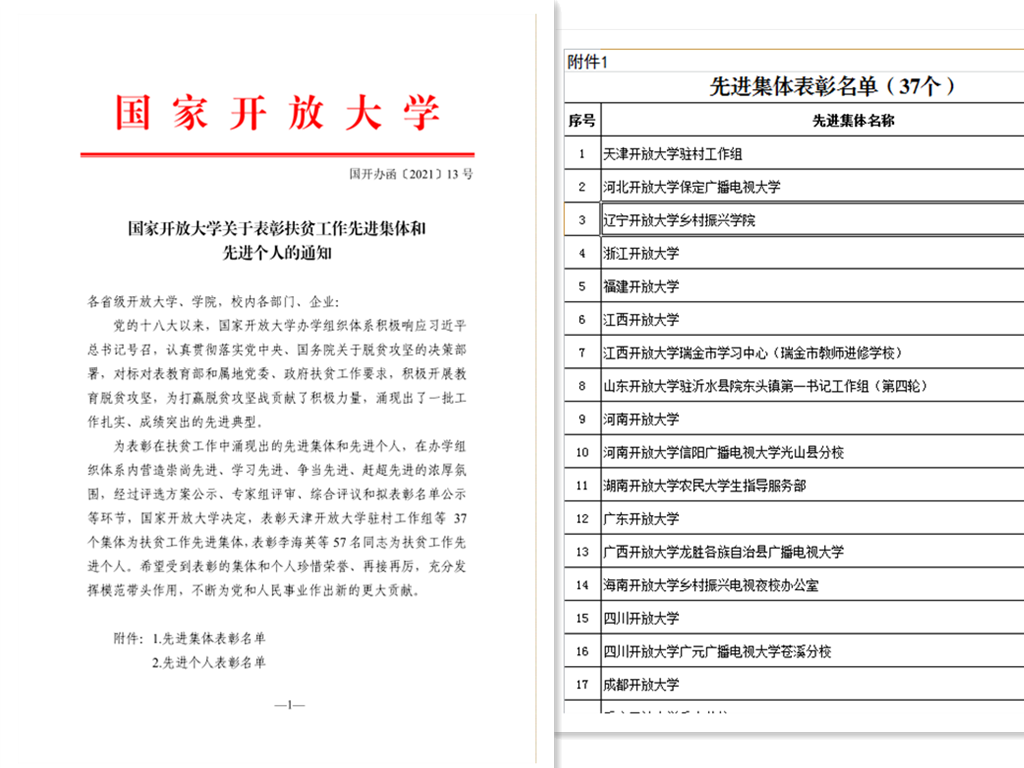 近日,国家开放大学印发《关于表彰扶贫工作先进集体和先进个人的通知》(国开办函〔2021〕13号),我校获评国家开放大学扶贫工作先进集体。