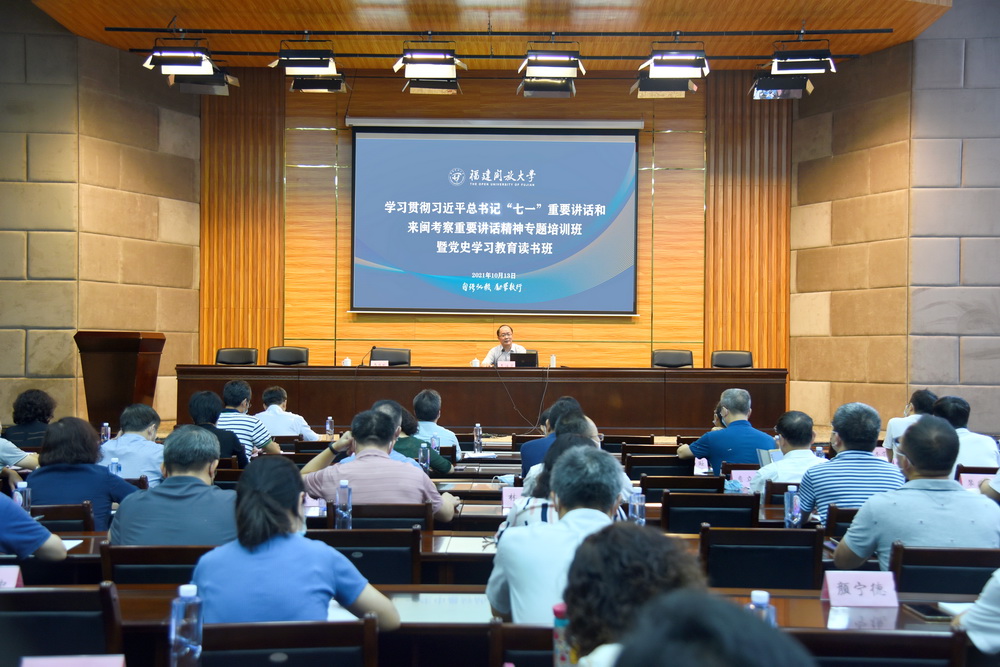 根据学习贯彻习近平总书记“七一”重要讲话和来闽考察重要讲话精神专题培训班暨党史学习教育读书班安排,10月13日下午,学校邀请福建省委党校马克思主义研究院院长李海星教授作题为《习近平总书记来闽考察重要讲话精神解读》的专题讲座。党委副书记马成斌主持,全校处级干部,各党总支、党支部书记参加学习。