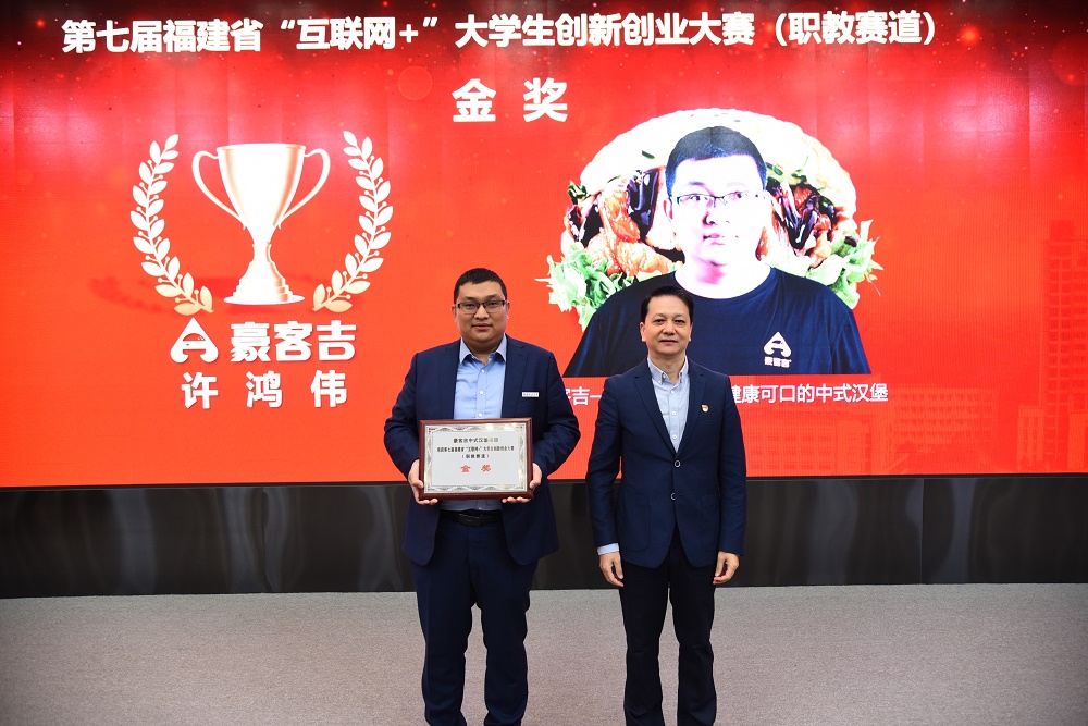 校党委书记陈兴炎向大学生创新创业大赛金奖项目豪客吉负责人颁奖