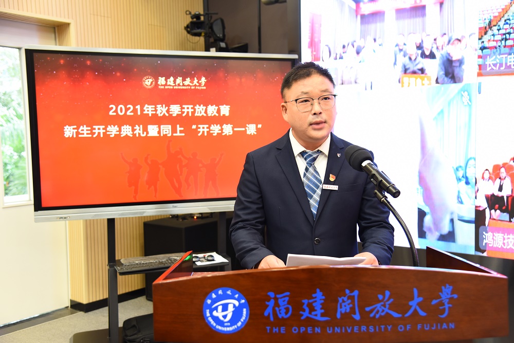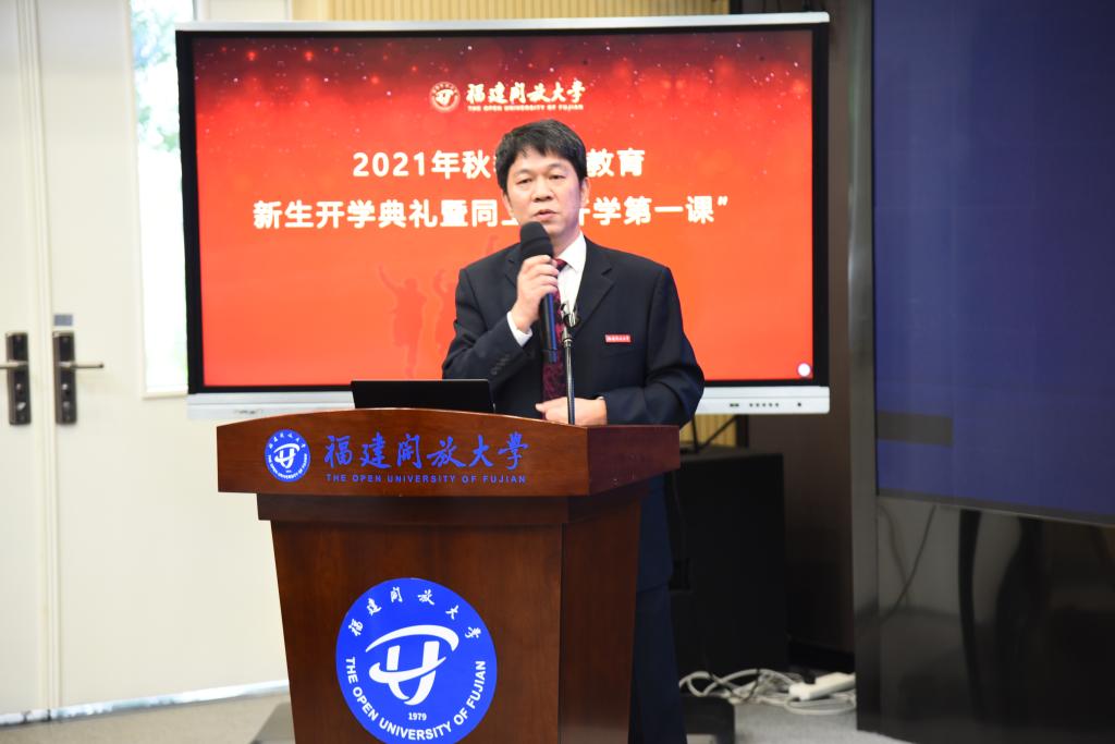 校党委书记陈兴炎在致辞中向新同学表示欢迎。他介绍了福建开放大学的历史,以“自强弘毅、励学敦行”校训精神与大家共勉,希望同学们珍惜韶华、奋发有为,努力成为德才兼备的有用之才、栋梁之才。一要“立大志”,以“自强”的精神信念铸就梦想之魂。二要“明大德”,以“弘毅”的坚韧品格丰足梦想之翼。三要“成大才”,以“励学”的刻苦努力筑牢梦想之基。四要“担大任”,以“敦行”的前进步伐成就梦想之实。