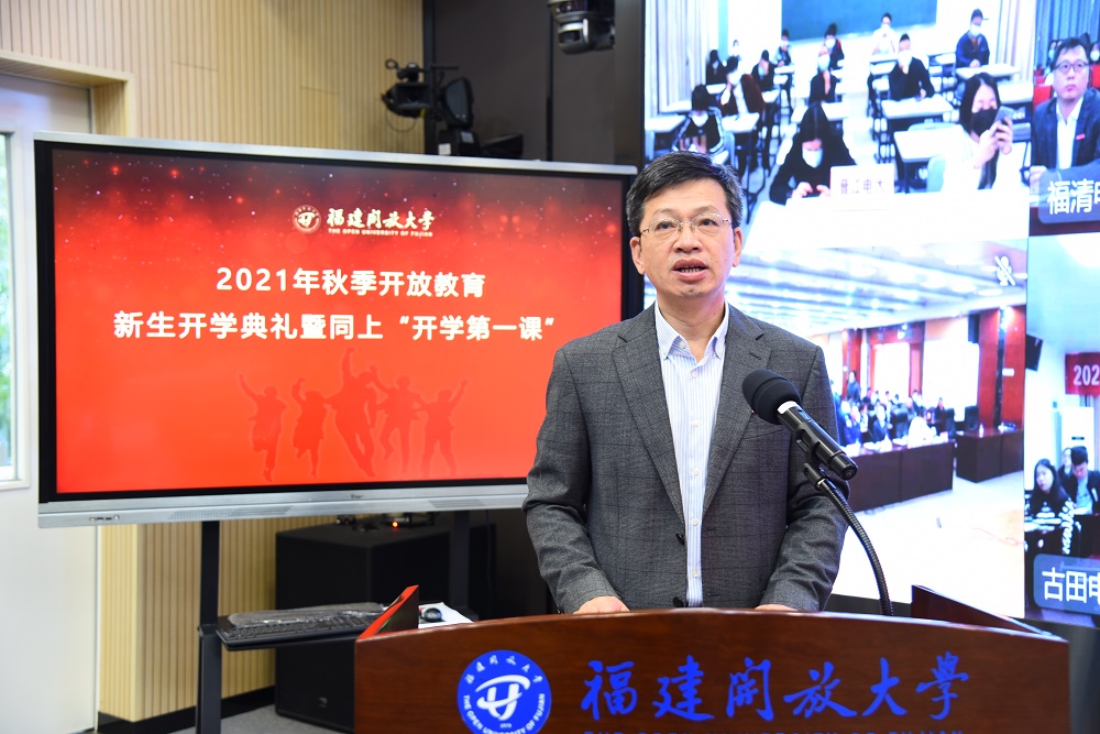 10月23日上午,福建开放大学举办全省办学系统开放教育新生开学典礼,并同上“开学第一课”。校领导陈兴炎、吴国荣、马成斌、王幼新与学校相关部门负责人和教师、班主任,以及全省各市县电大、教学点2021年秋季入学的19900多名新生通过现场、分会场和“云参与”方式参加活动。典礼由校党委副书记马成斌主持。