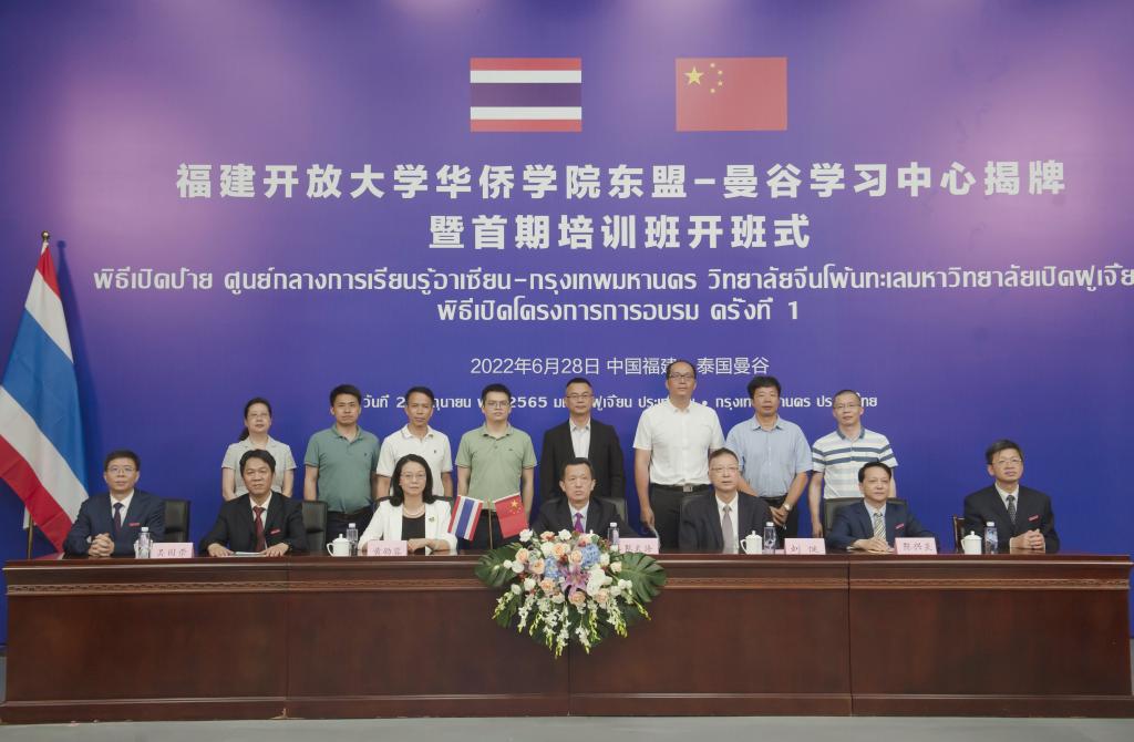 6月28日下午,学校华侨学院首个海外学习中心东盟-曼谷学习中心在泰国揭牌成立,并启动首期泰国线下茶文化培训班。活动通过线上线下同步在中国福建开放大学、泰国瓦莱岚大学双会场举行。