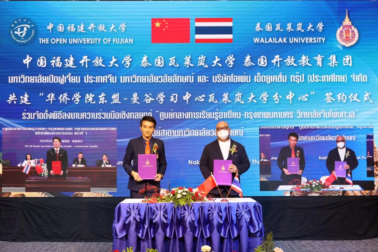 仪式上,我校与泰国开放教育集团签署《福建开放大学华侨学院东盟—曼谷学习中心战略合作协议》,并与瓦莱岚大学签署三方合作备忘录。Phinij Jarusombat、Prakob Rattanapan、Patcharinruja Juntaronanont、Suttikorn Jearpaitoon、Voravuth Somsak、赵明光在泰国会场为福建开放大学华侨学院东盟-曼谷学习中心及瓦莱岚大学分中心揭牌,在中国会场的嘉宾远程在线见证了这一时刻。