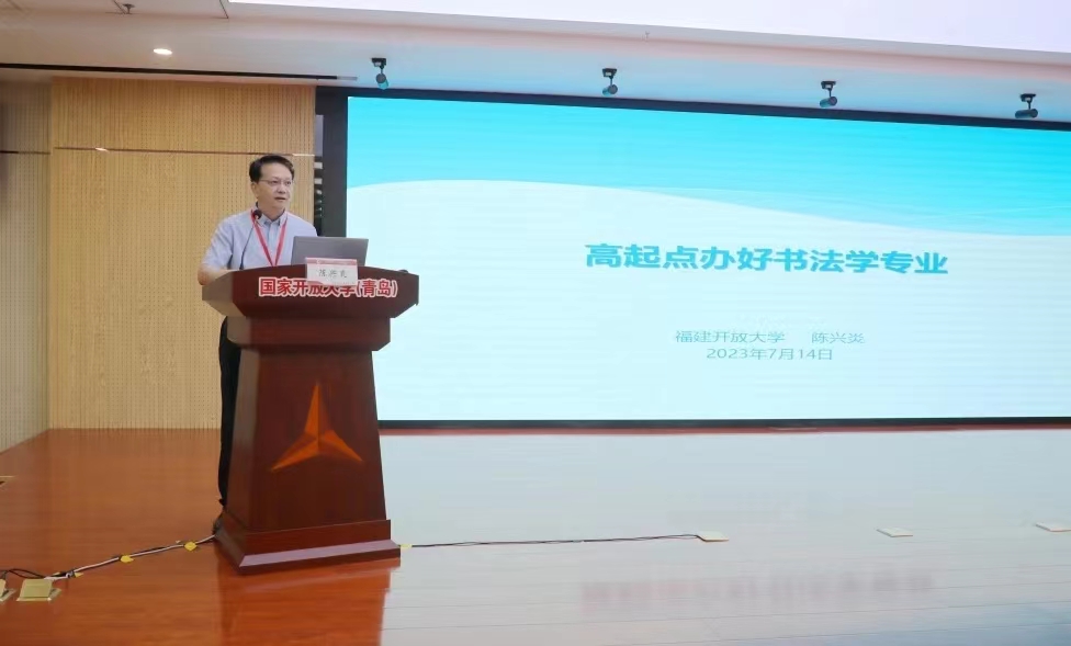 7月14日,为贯彻落实习近平总书记关于美育工作重要指示精神,打造具有国家开放大学特色的美育模式体系,2023年度国家开放大学美育工作研讨会在青岛召开。中国美术家协会原分党组书记、副主席徐里发表视频致辞,国家开放大学教务部部长古小华、学生和教师发展部副部长田素霞、学习资源部副部长程千等到会讲话。福建开放大学党委书记陈兴炎、文经学院院长王妙真、书法学专业主任齐学东等参加会议。