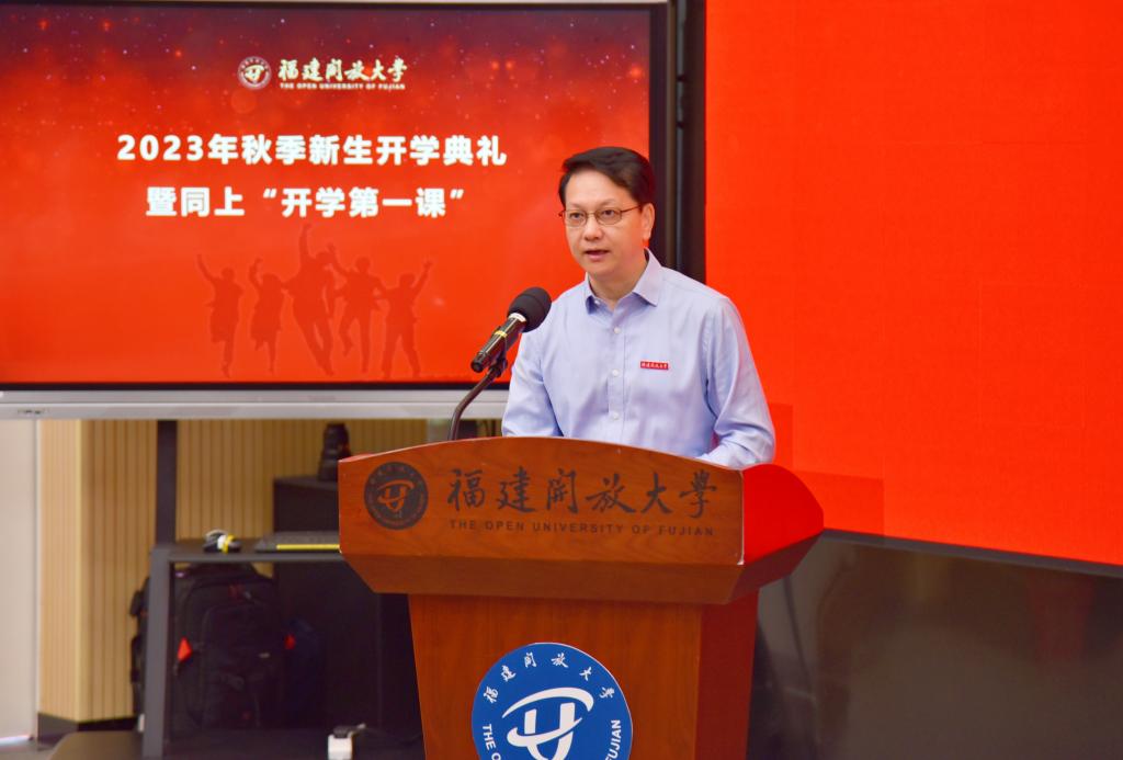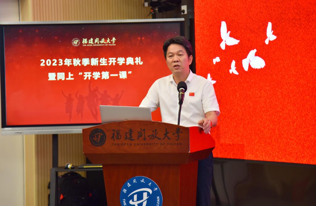 党委副书记、校长吴国荣以《改革开放的伟大实践》为题,为新生上“开学第一课”。他以“改革开放是我们党的一次伟大觉醒”为切入点,介绍福建开放大学跟随改革开放脚步从“站起来”、“富起来”到“强起来”的发展历程出发,回顾改革开放的历史进程、伟大成就和战略擘画,重温了改革开放的经典语录,勉励同学们继承弘扬改革开放精神,必须继承发扬老一辈无产阶级革命家的优良革命传统,在奋力推进中国式现代化建设、全面推进中华民族伟大复兴作出新的贡献。