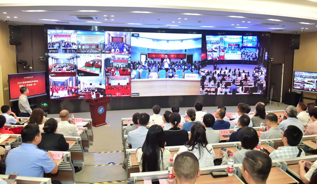 10月14日上午,学校举办2023年秋季新生开学典礼,并同上“开学第一课”。校领导陈兴炎、吴国荣、马成斌、沈光辉、王幼新、吴建铭、李正光,学校相关部门负责人和师生代表在桂山校区主会场,全省各市县开大、教学点的师生通过分会场和收看线上直播方式参加活动。典礼由党委副书记马成斌主持。