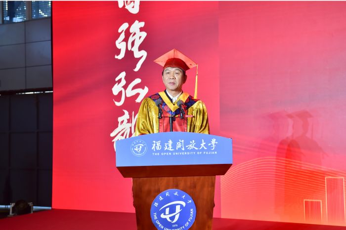随后,吴国荣致辞。他代表学校向毕业生们表示热烈的祝贺,向辛勤耕耘、默默付出的老师们致以崇高的敬意。他对毕业生深情寄语,提出了四点希望:一要在民族复兴中把准信念之舵,坚定心系家国的人生航向。要以远大志向指引人生方向,向“全国技术能手”俞海金、“最美资助人”林长宣、“全国优秀人民警察”洪树棠、“全国劳动模范”卓明华等优秀校友看齐,在服务国家需要和社会需求中寻找人生真谛和事业方向,追求更有高度、更有境界、更有价值的人生。二要在时代洪流中扎稳立身之本,涵养崇德向善的良好品质。在纷繁复杂的社会中,依然能够坚持良好的道德品质和正确的价值取向,坚守内心的净土和做人的原则,在立德修身中不断走向成熟,始终做一个正直的人、纯粹的人、高尚的人。三要在学无止境中高扬奋进之帆,锻造搏击风浪的过硬本领。提升自我驱动力,争当终身学习的先行者;激发自我创造力,培养符合新时代要求的综合能力,勇做发展潜能的开拓者。四要在知行合一中集聚实干之力,成就逐梦前行的精彩人生。在未来工作生活中,把知行合一作为目标,把坚持不懈作为信条,始终以实干家的态度在成长道路上驱散浮躁功利与现实羁绊,以奋斗者的脚步在实现梦想征途上行稳至远。