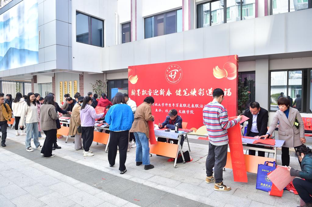 无联不成春,有联春更浓。1月16日上午,为迎接龙年新春的到来,弘扬中华优秀传统文化,向师生传递美好的祝福与关爱,由校工会、文经学院共同举办的“翰墨飘香迎新春,健笔焕彩送万福”写春联送祝福暨书法学专业教学成果展示活动在左海校区广场和新建成的书法学专业教室同步举行。校党委书记庄莉、副校长沈光辉出席活动。