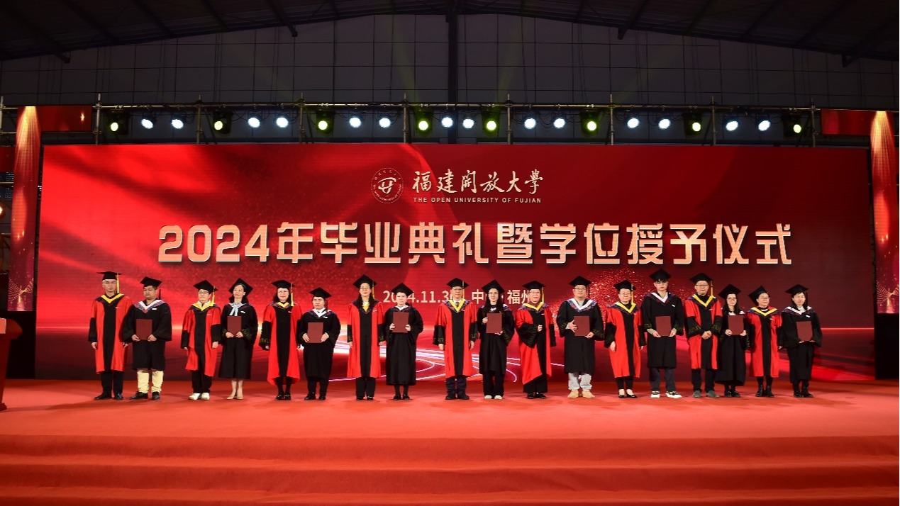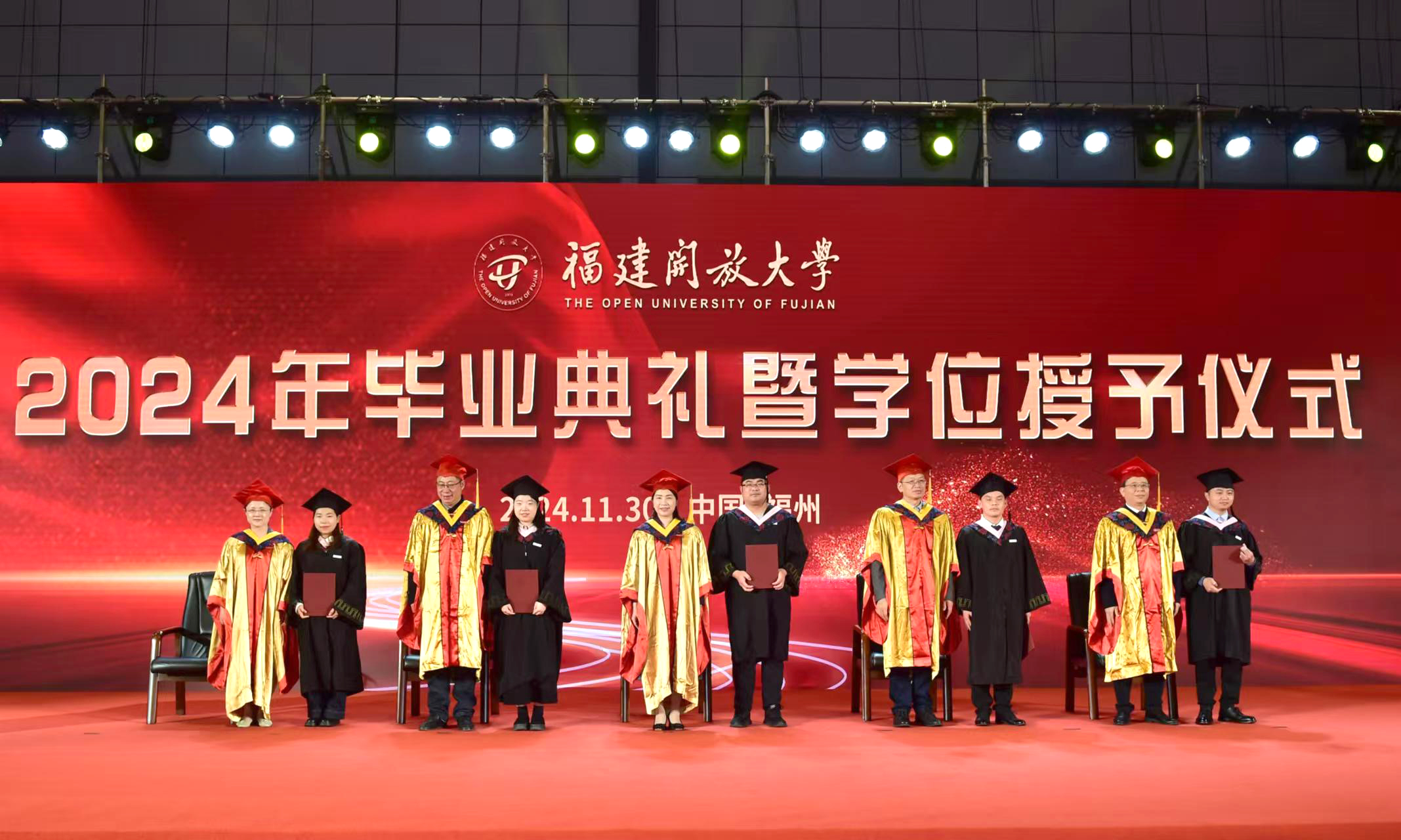 11月30日下午,福建开放大学2024年毕业典礼暨学位授予仪式在桂山校区体育馆举行。校党委书记庄莉、校党委副书记马成斌、副校长吴建铭、副校长李正光、纪委书记李琳出席典礼,国家开放大学学位评定委员会委员,全省办学体系导师代表,相关部门、学院负责人,获得学位的毕业生及其他毕业生代表300多人参加了主会场活动。毕业典礼以主分会场、线上线下互联互通的方式举行。全省万名师生通过观看直播,共同见证这一重要时刻。典礼由李正光教授主持。