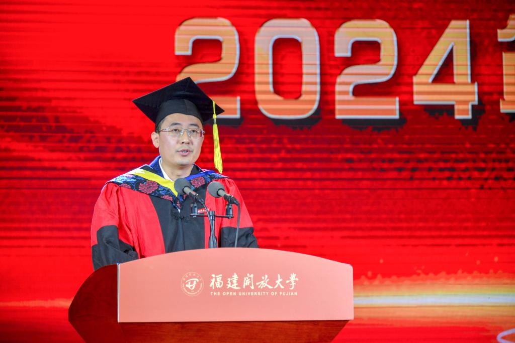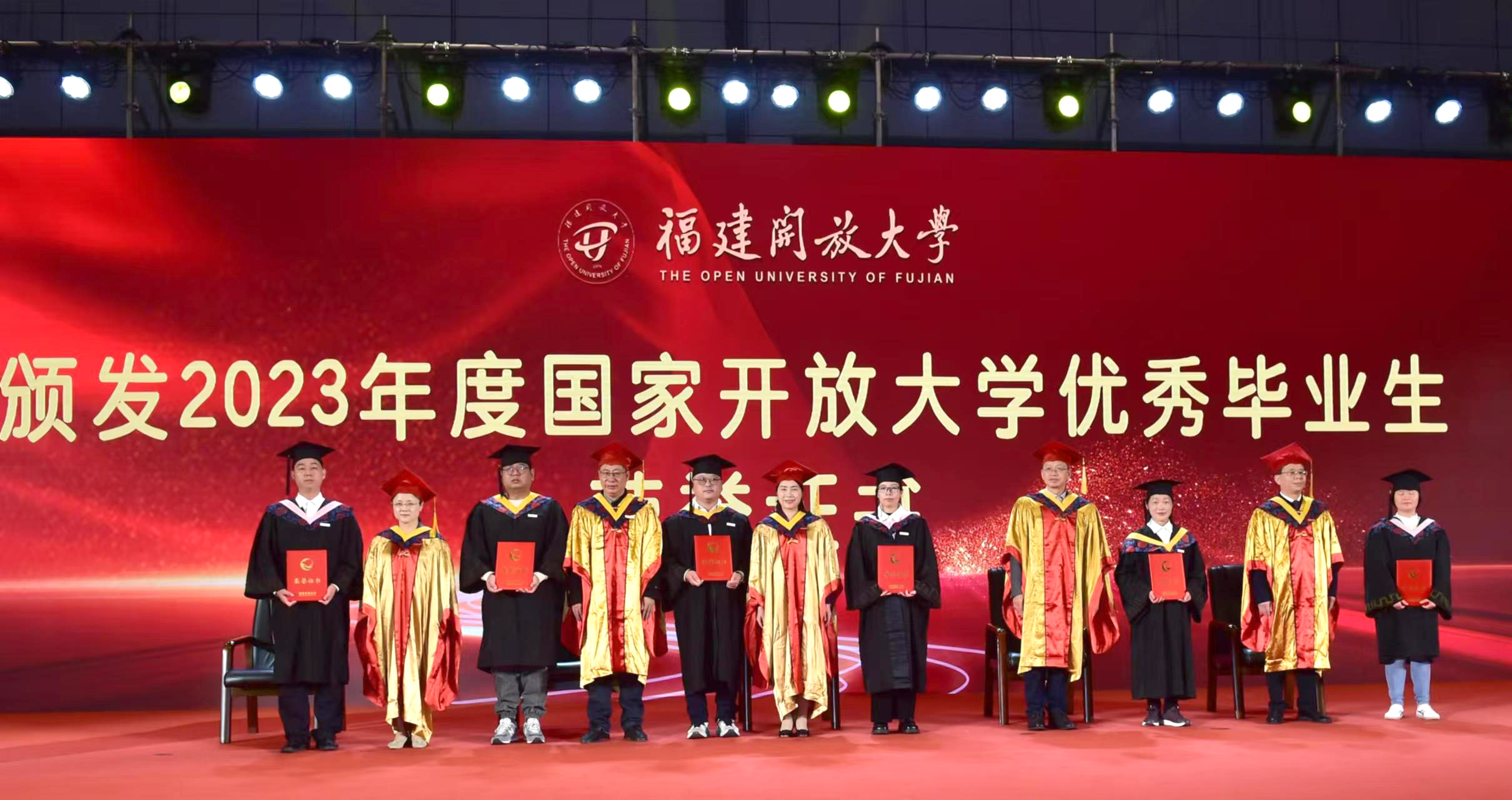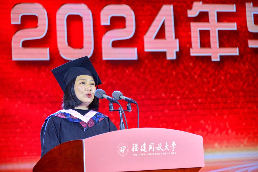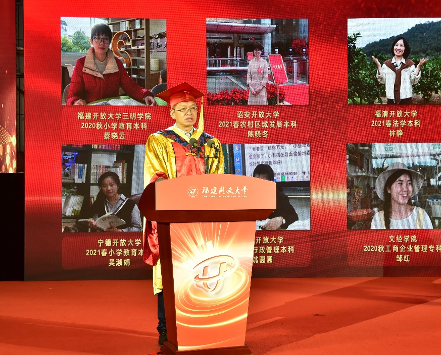 教师代表黄伯平副教授作发言,他希望同学们在今后的人生长跑中,要乐观向上,保持积极进取的心态;要砥砺奋进,勇于担当责任;要持之以恒,坚持终身学习。优秀毕业生代表林静回顾了自己在校求学的成长故事,勉励同学们从容、勇敢地面对学习的困难与挑战,克服工学矛盾,努力提升自己,不断书写新时代中国青年和开大学子的最美篇章。典礼在全体人员共同合唱《福建开放大学校歌》中圆满结束。