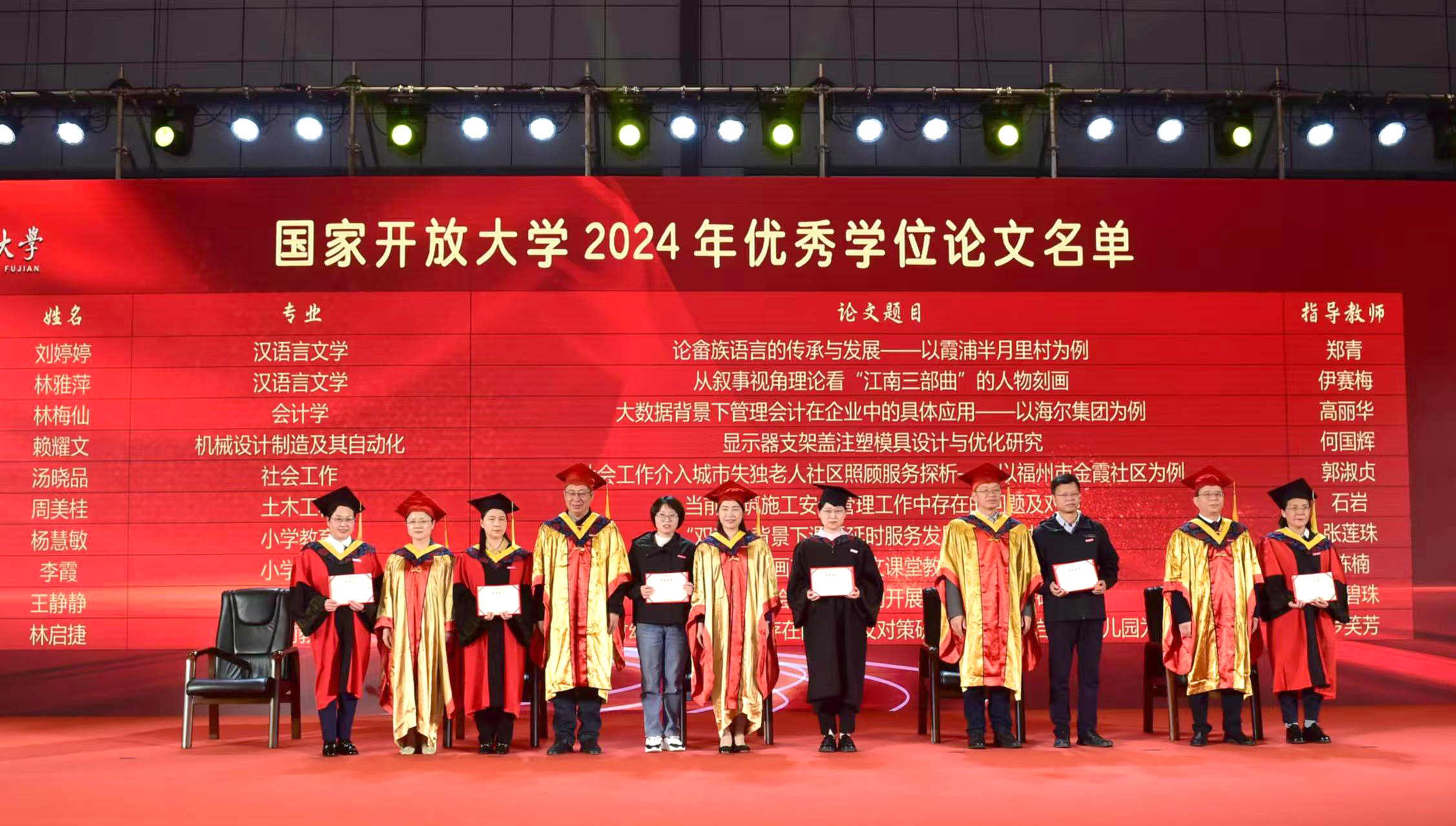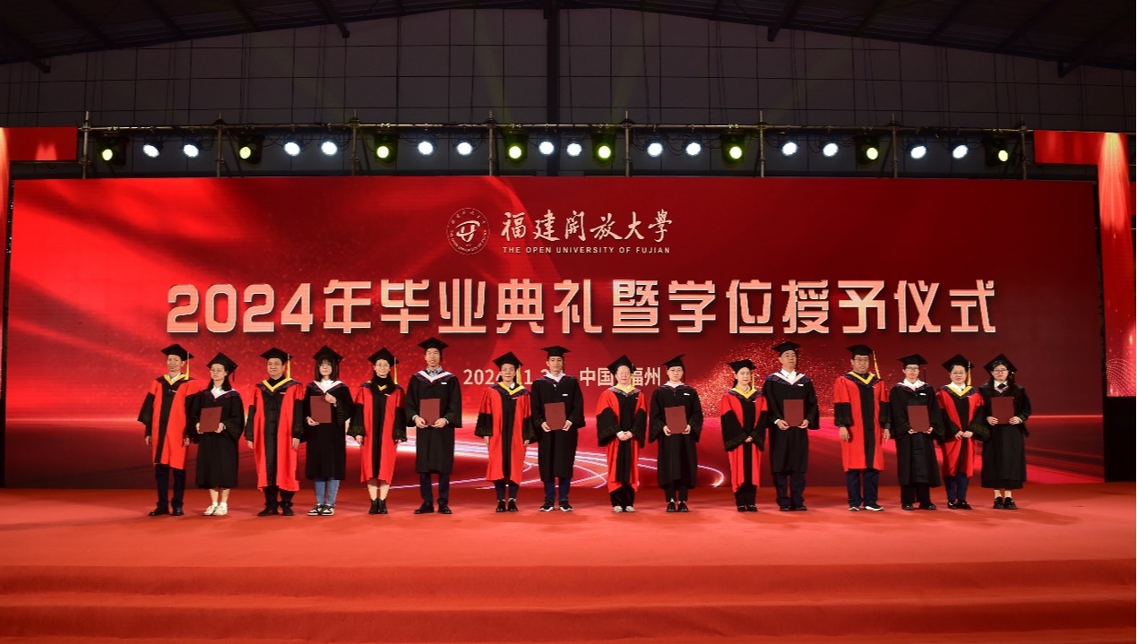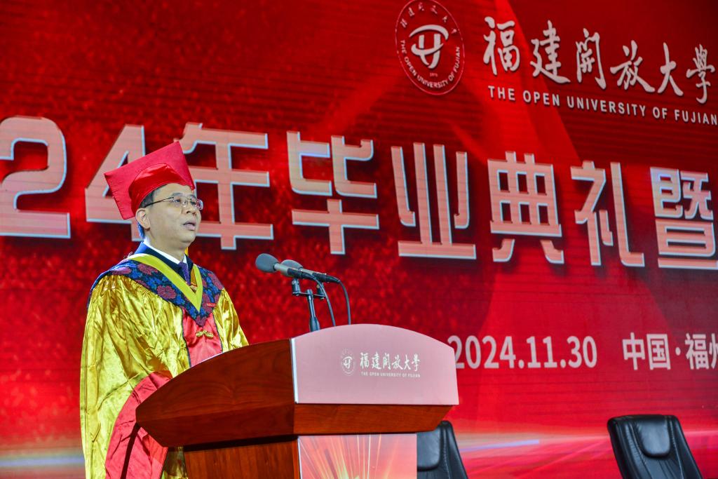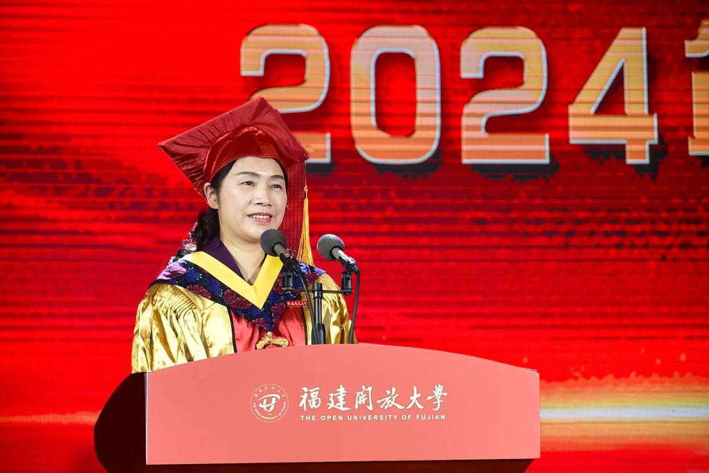 教师代表黄伯平副教授作发言,他希望同学们在今后的人生长跑中,要乐观向上,保持积极进取的心态;要砥砺奋进,勇于担当责任;要持之以恒,坚持终身学习。优秀毕业生代表林静回顾了自己在校求学的成长故事,勉励同学们从容、勇敢地面对学习的困难与挑战,克服工学矛盾,努力提升自己,不断书写新时代中国青年和开大学子的最美篇章。典礼在全体人员共同合唱《福建开放大学校歌》中圆满结束。