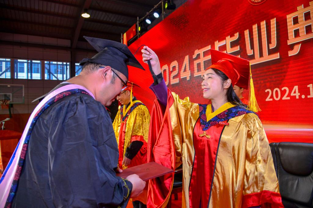 毕业生们伴着欢快的音乐整齐步入体育馆,在庄严的国歌声中,典礼正式拉开帷幕。马成斌宣读了2023年优秀毕业生名单。李正光宣读了2024年优秀学位论文获得者及指导教师名单、2024年毕业生和学位获得者名单。校领导为主会场优秀毕业生代表、获评优秀学位论文的学生及指导教师颁发荣誉证书,并与国开学位评定委员会委员和全省办学体系导师代表共同为毕业生代表颁发学士学位证书,授予学士礼。