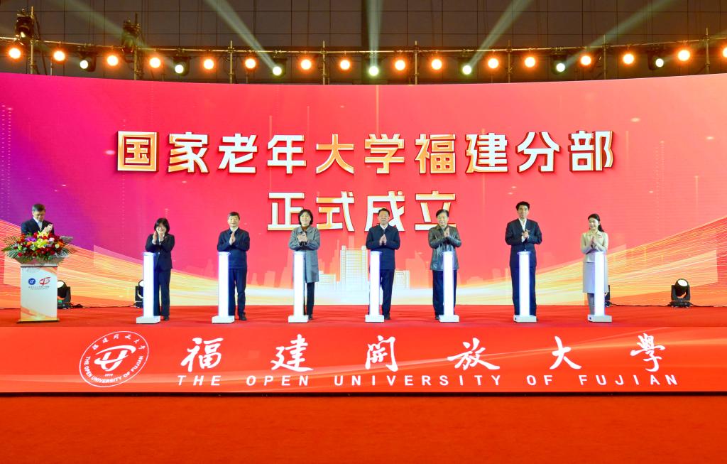 大会启动国家老年大学福建分部。余军、杨根生、李红、王启明、叶燊、庄莉、范贤睿共同按下启动键,宣布国家老年大学福建分部成立。