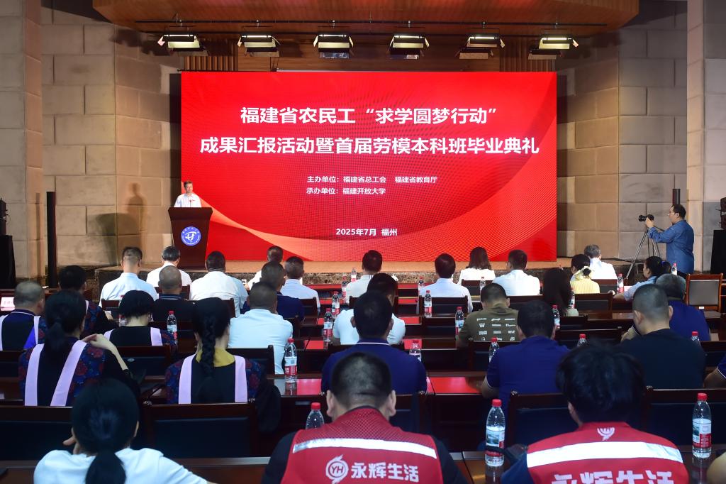 7月12日上午,由福建省总工会、福建省教育厅主办,福建开放大学(福建省农民工“求学圆梦行动”协调办公室)承办的福建省农民工“求学圆梦行动”成果汇报活动暨首届劳模本科班毕业典礼在我校桂山校区举行。