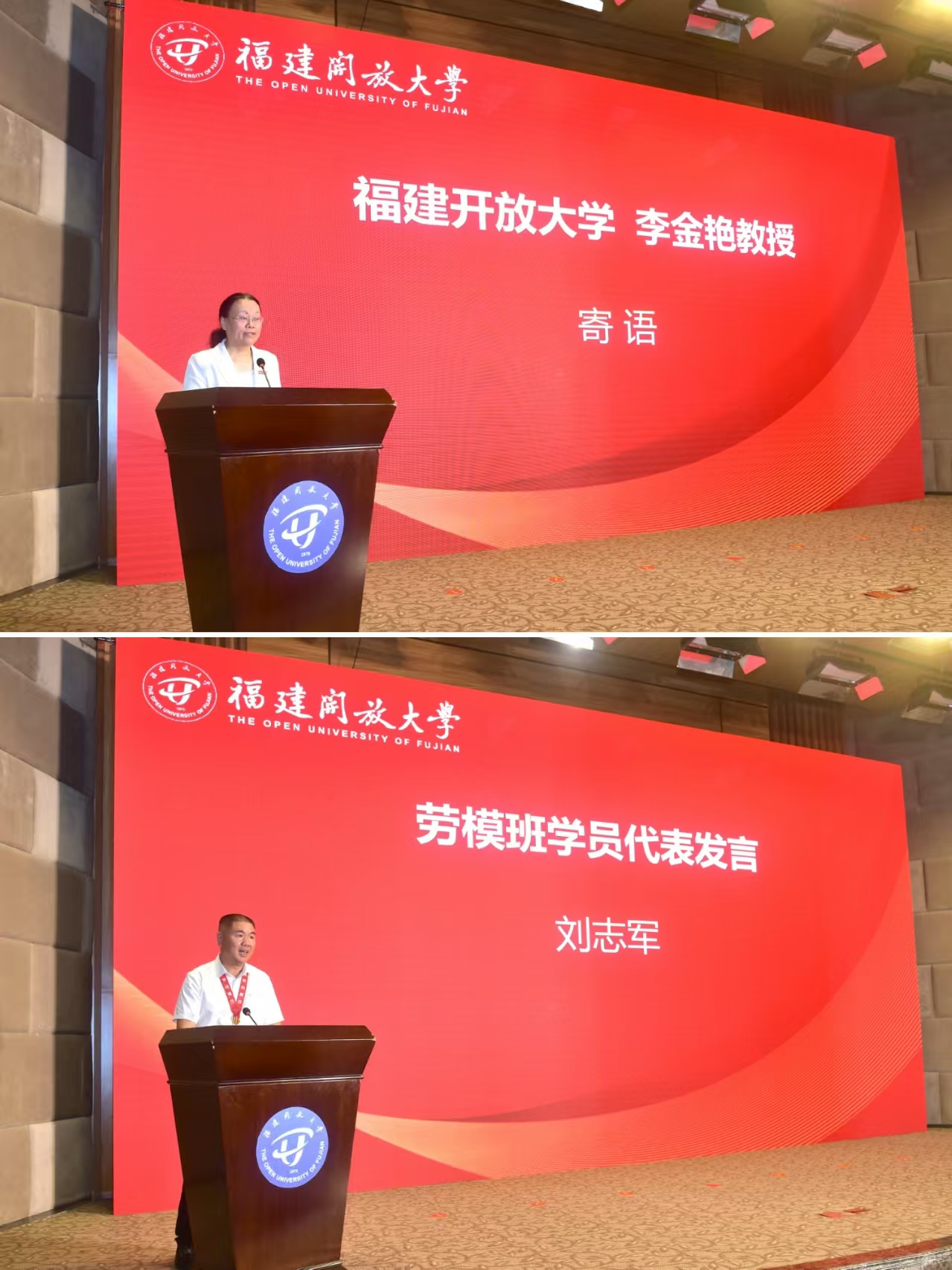 庄莉代表学校致辞,她从实现广度与深度双拓展、推动学历与技能双提升、形成辐射与示范双效应等方面总结了我省农民工“求学圆梦行动”取得的良好成效。她指出,产业工人队伍建设改革是党和国家一项具有战略性、全局性的重大决策部署,学校将秉持“办出福建特色、彰显开大优势、打造精品项目”的理念,持续开展好“求学圆梦行动”,为产业工人提供更多优质的教育资源,努力推动该项目成为我省产业工人学历技能提升的育人阵地、成才高地和示范基地。她对58名首届劳模本科班毕业生们表示热烈的祝贺,勉励学员们始终葆有劳模精神、劳动精神和工匠精神,把所学知识转化为现实生产力,争做爱岗敬业的示范者、艰苦奋斗的践行者、精益求精的引领者;始终秉持创新意识、进取意识和担当意识,在各自领域里敢为人先、勇攀高峰,为推进中国式现代化福建实践作出新的更大贡献。