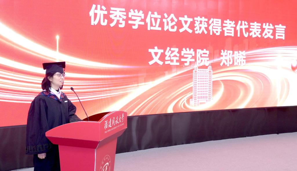 优秀学位论文获得者代表郑晞发言。她对老师们表达了最诚挚的敬意,分享了在申报学位过程中要对学术研究秉持严谨认真精神的心得体会,以及“唯有坚持不懈,方能抵达成功彼岸”的人生道理。
