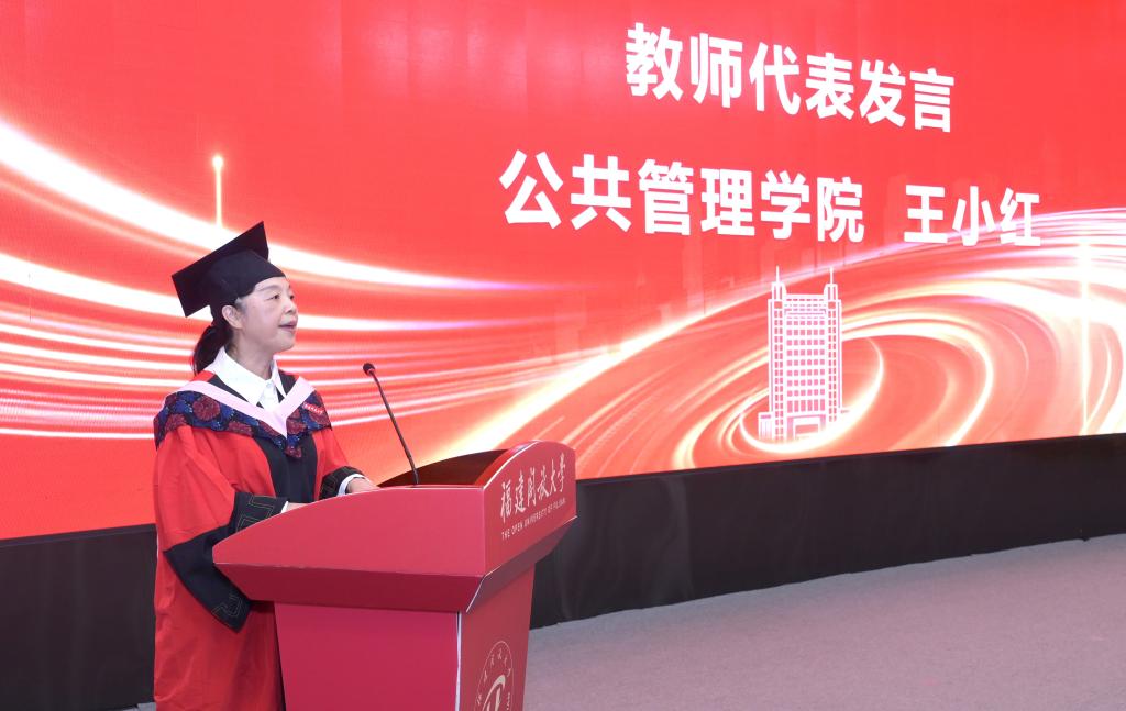 教师代表王小红副教授发言。她希望广大学生能通过努力翻过学位英语这座“大山”,祝愿每一位同学,在人生的新阶段步履从容、生活美满,不断书写属于自己的精彩篇章。