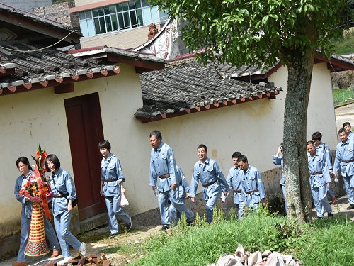 全体党员、教职工身着红军服,高举党旗,沿着19世纪30年代中国工农红军第四军在屏山村留下的足迹,徒步来到红四军驻地、朱德旧居、红军无名战士纪念碑参观,向无名战士纪念碑敬献花篮,并聆听了屏山乡关工委郭直呈为大家作的红军光辉历史和无名战士的感人事迹介绍。