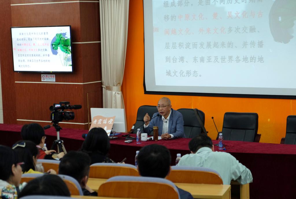 郑镛首先向大家详细而深入地阐述了闽南文化的概念,并从三个方面全面分析了闽南文化的特质——闽南文化的包容性决定了其多元杂糅性,由聚族而居产生的闽南民间社会完整性决定其传承的持续性,而海洋文化的属性又决定了其传播的迁移性。随后,他引导大家从闽南的地理环境和文化教育的视角,去探寻闽南人文性格生成的原因,并总结和提炼出闽南人文性格的特点——山的坚韧、海的豪迈以及平原的坦荡。他深刻而犀利地指出了闽南人文性格中包含的优秀内涵和固有的缺陷,他说:“闽南人就是敢为人先,提倡爱拼才会赢;心系家国,会逐利却也重义;有着悲悯的情怀和抗争的血性却也讲究面子,崇尚奢华。” 讲座风趣幽默,引人入胜,使听众加深了对闽南本土文化的了解和认识,让大家充分的领略和感受到闽南传统文化的博大精深和无穷魅力。
