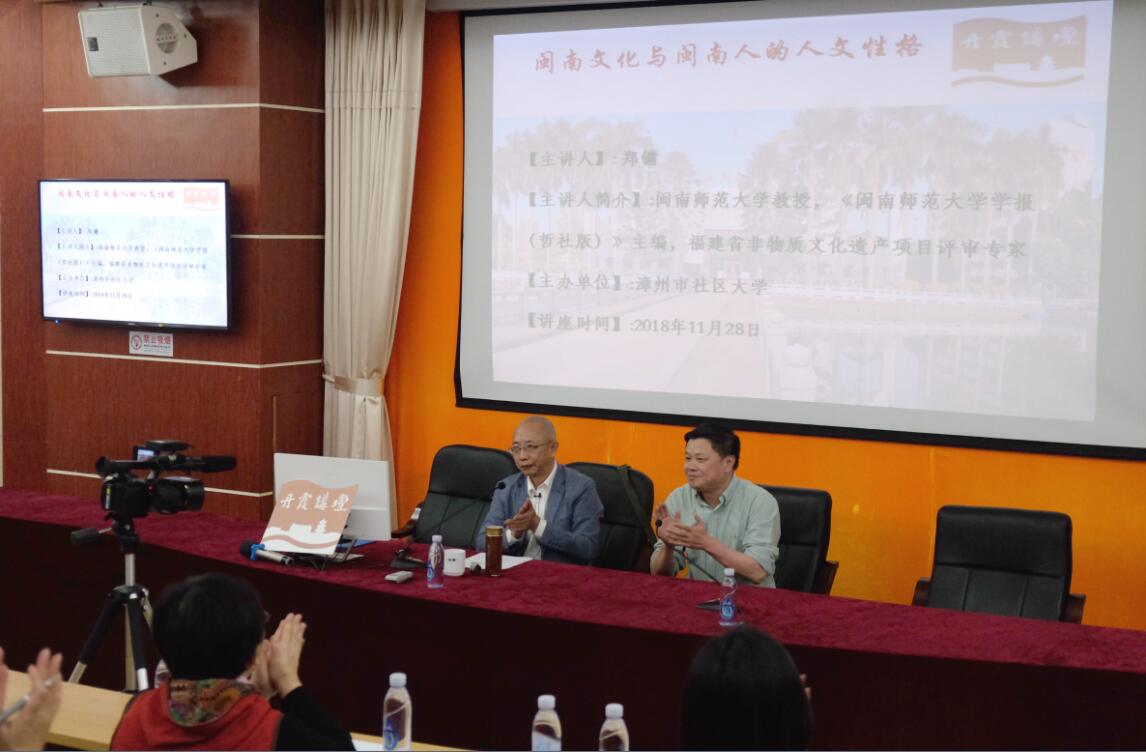 11月28日晚,闽南师范大学教授、《闽南师范大学学报(哲社版)》主编、福建省非物质文化遗产项目评审专家郑镛做客漳州市社区大学“丹霞讲坛”, 为漳州电大全体教职员工、市文艺各界朋友、部分学生以及社区居民带来了一场题为《闽南文化与闽南人的人文性格》的专题讲座。讲座由漳州电大党委书记、校长李然主持。
