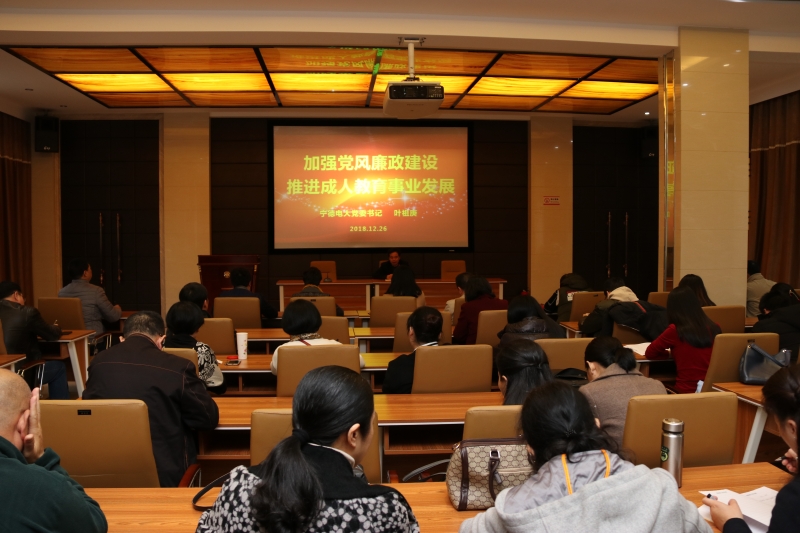 2018年12月26日,宁德电大党委书记叶祖庚以《加强党风廉政建设,推进成人教育事业发展》为题,给全体教职工上廉政专题党课,进一步强化廉洁自律意识,教育引导教师廉洁从教,营造风清气正的干事创业环境,为电大持续健康发展提供坚强保障。副校长王晓飚主持党课。
