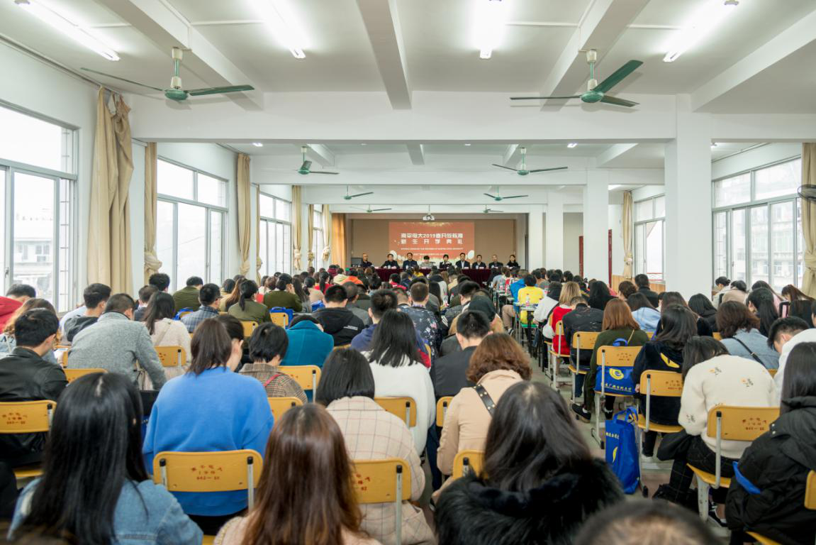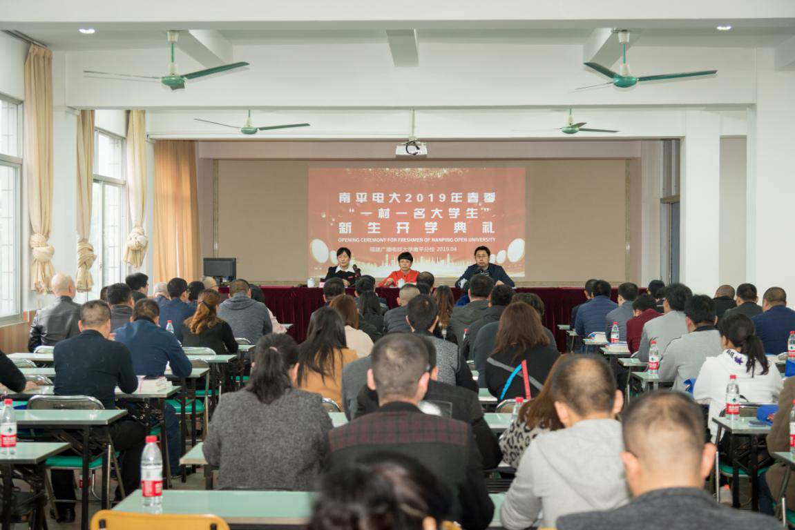 4月14日,南平电大在教学楼七楼分别举行2019年春季开放教育新生和 “一村一名大学生”新生开学典礼。开学典礼由副校长杨丽琴主持,南平电大领导、全体教职工及2019春新生参加了典礼活动。