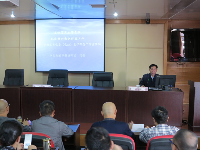 为提高意识形态工作主体责任意识,全面落实意识形态工作责任制,5月9日下午,龙岩电大党支部邀请龙岩市委讲师团团长冯岳作《主动落实主体责任,扎实做好意识形态工作--全面落实党委(党组)意识形态工作责任制》专题辅导讲座。讲座由校党支部委员、办公室主任邱友祥主持。