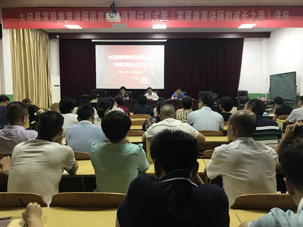 6月17日上午,大田县家庭教育讲师团首批讲师聘任仪式在教师进修学校一楼阶梯教室举行。首批30名讲师及来自各中学、小学、幼儿园、特校、职专分管德育的副校长共70多人参加。