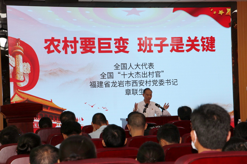 章书记结合自身40多年扎根基层的工作经历和30多年基层党支部书记的工作经验,用生动鲜活的事例、幽默风趣的语言,讲述了自己在革命老区、中央苏区的龙岩西安村带领全村党员同志坚持传承红色基因、牢记为民宗旨,发扬开拓创新、艰苦奋斗的精神,充分发挥基层党组织战斗堡垒作用,依靠全村群众将昔日贫穷落后的西安村发展成为经济综合实力名列前茅的“闽西第一村”的故事。章书记用“十三字经”--“铜头、铁嘴、橡皮肚、飞毛腿、方、圆、度”作为他的实践总结。这些宝贵的经验很好地验证了“农村要巨变、班子是关键”“一个村子富不富、关键在于党支部”“一个班子强不强,关键在于领头羊”。章书记也指出当前农村存在的一些问题,并对做好农村工作提出建议。