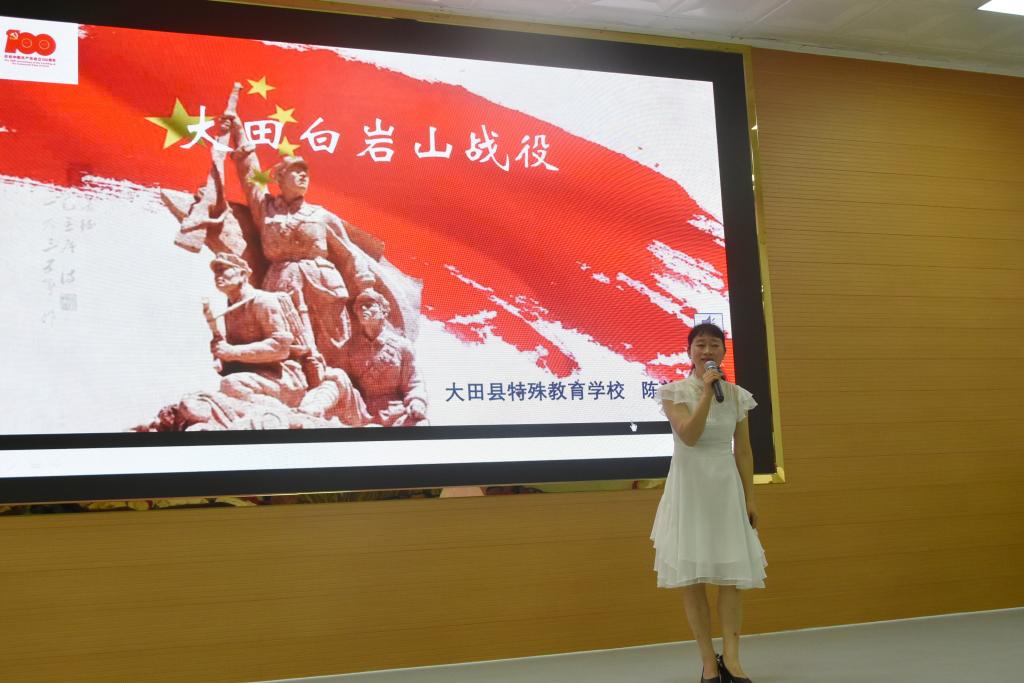 文艺党课共两堂,第一堂党课进行红色故事宣讲。2021年春季学前教育(本科)专业学员、特殊教育学校教师陈美秀做作《大田白岩山战役》红色故事宣讲,2019年秋季学前教育(专科)专业学员、进修学校教师林小霞作《守墓》红色故事宣讲,特校杨伟婷老师带来《残障孩子也能拥有美好的未来》故事分享。她们声情并茂的宣讲,让红色文化得以推介,红色基因得以传承,教育初心得以传递,赢得大家阵阵掌声。