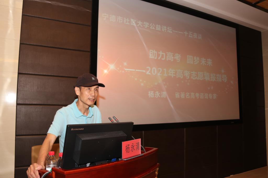 今年是新高考政策第一年,志愿如何填报是家长和考生们尤为关心的话题。6月19日上午,宁德市社区大学公益讲坛“十五夜谈”思民众之所需,邀请福建省著名高考志愿填报咨询专家杨永清为全市考生和家长解答实际报考中遇到的问题, 提供有效的高考志愿填报方法与技巧。近100名考生和家长现场听取了讲座,同时,通过宁德市教育局微信公众号在线直播。