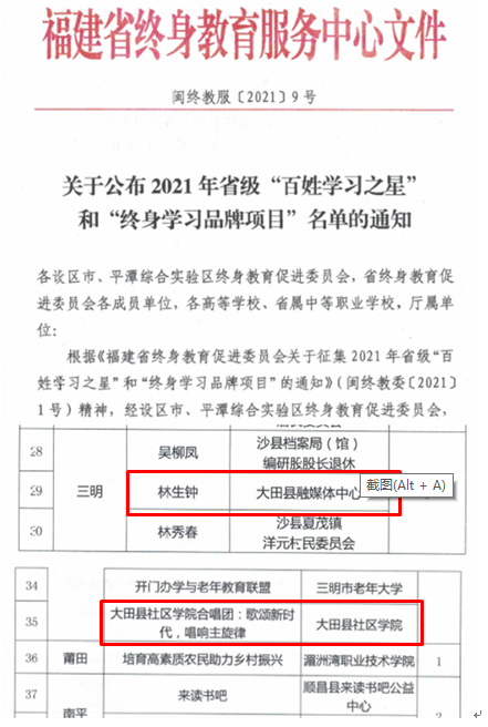 日前,省终身教育服务中心公布2021年省级 “百姓学习之星”和“终身学习品牌项目”名单,大田榜上有名。县融媒体中心林生钟获福建省“百姓学习之星”,“大田县社区学院合唱团:歌颂新时代 唱响主旋律”获福建省“终身学习品牌项目”。